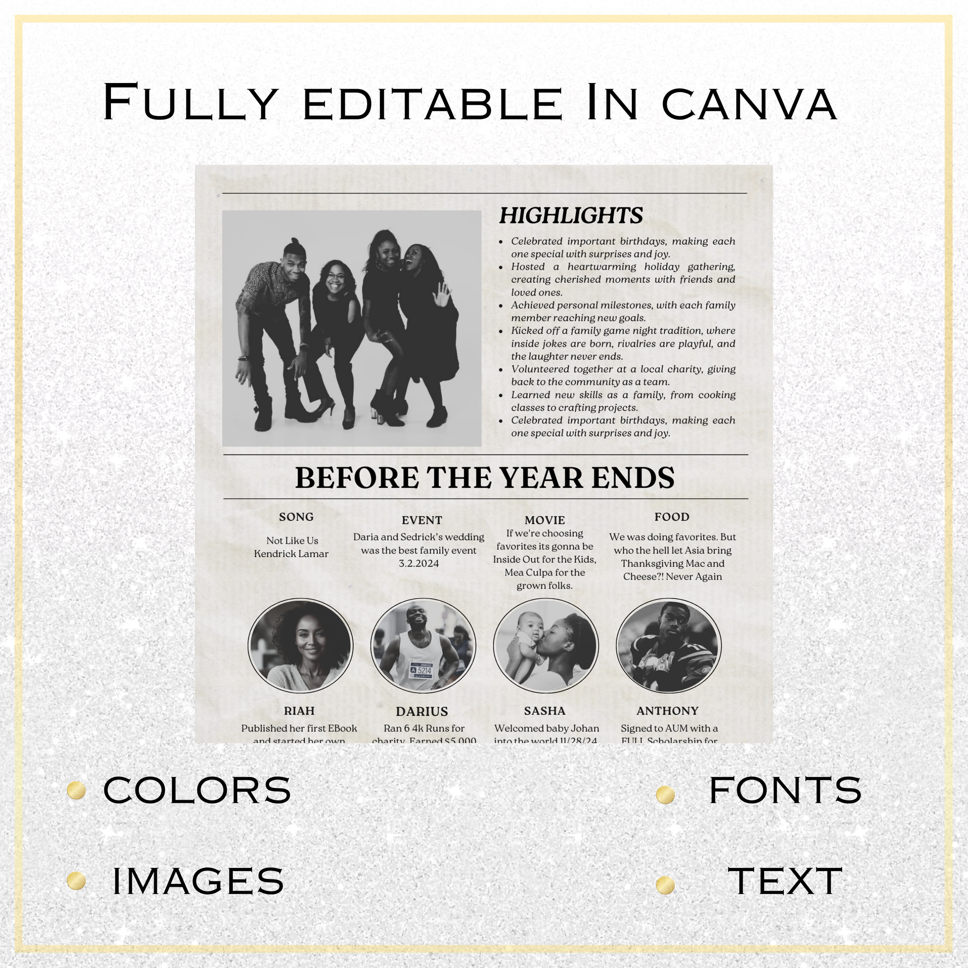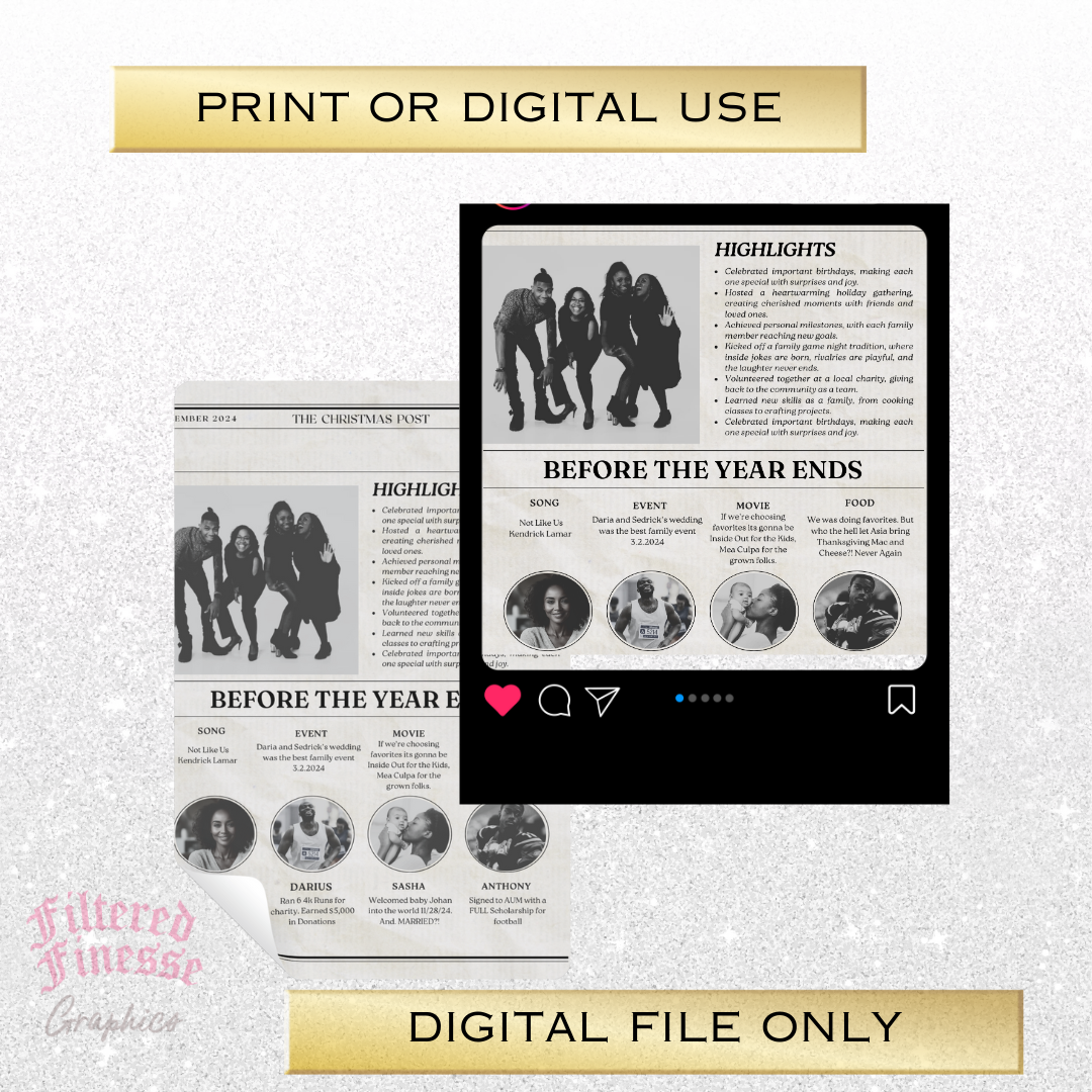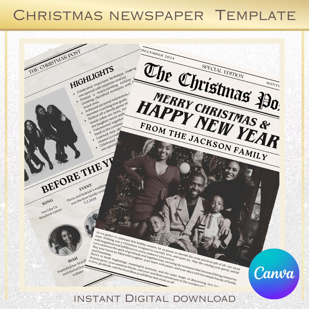 Step into the holiday spirit with our Christmas Newspaper “Post” Template—a creative way to highlight your year in review! Designed to look and feel like a real newspaper, this template lets you showcase important milestones, special moments, and your favorite memories from the year.