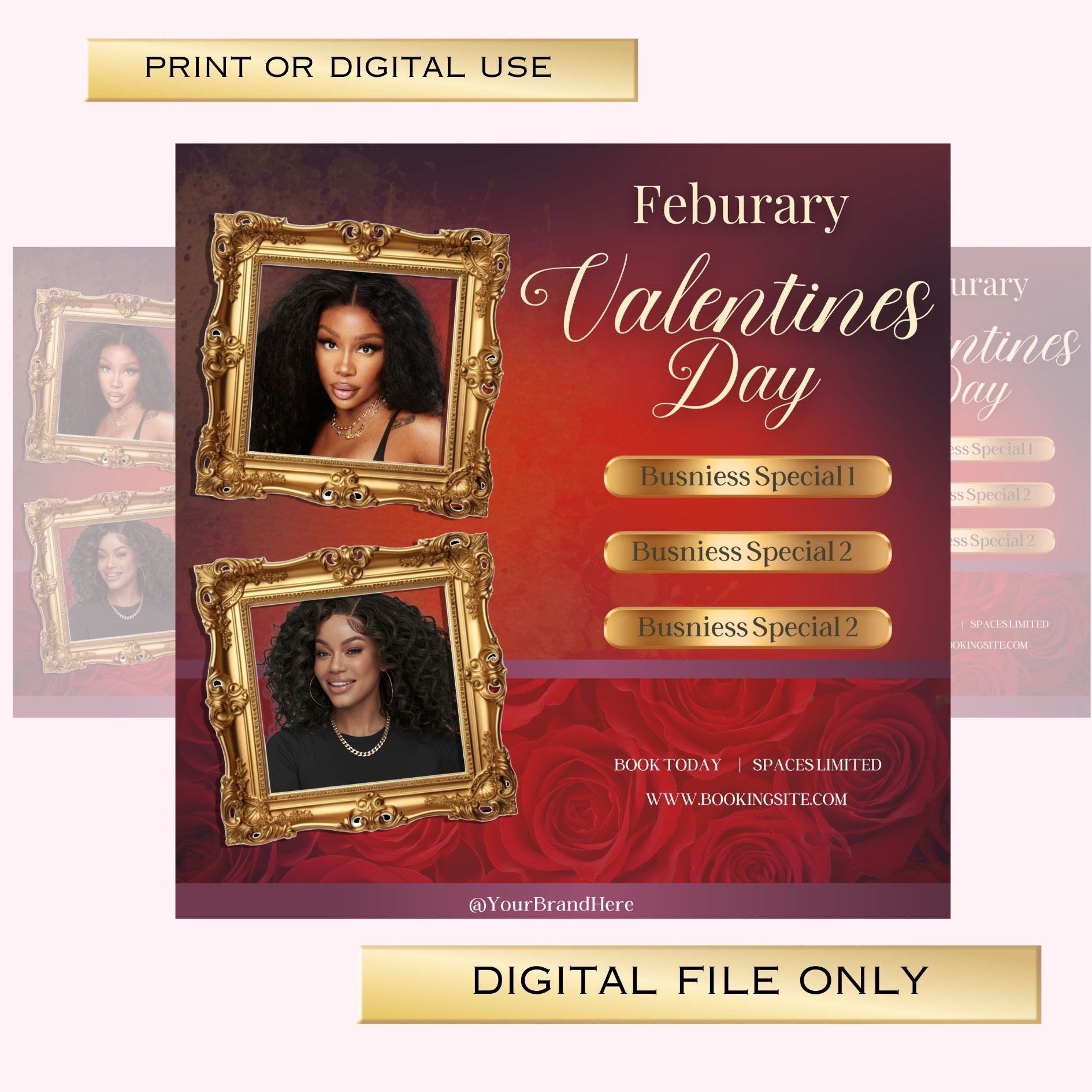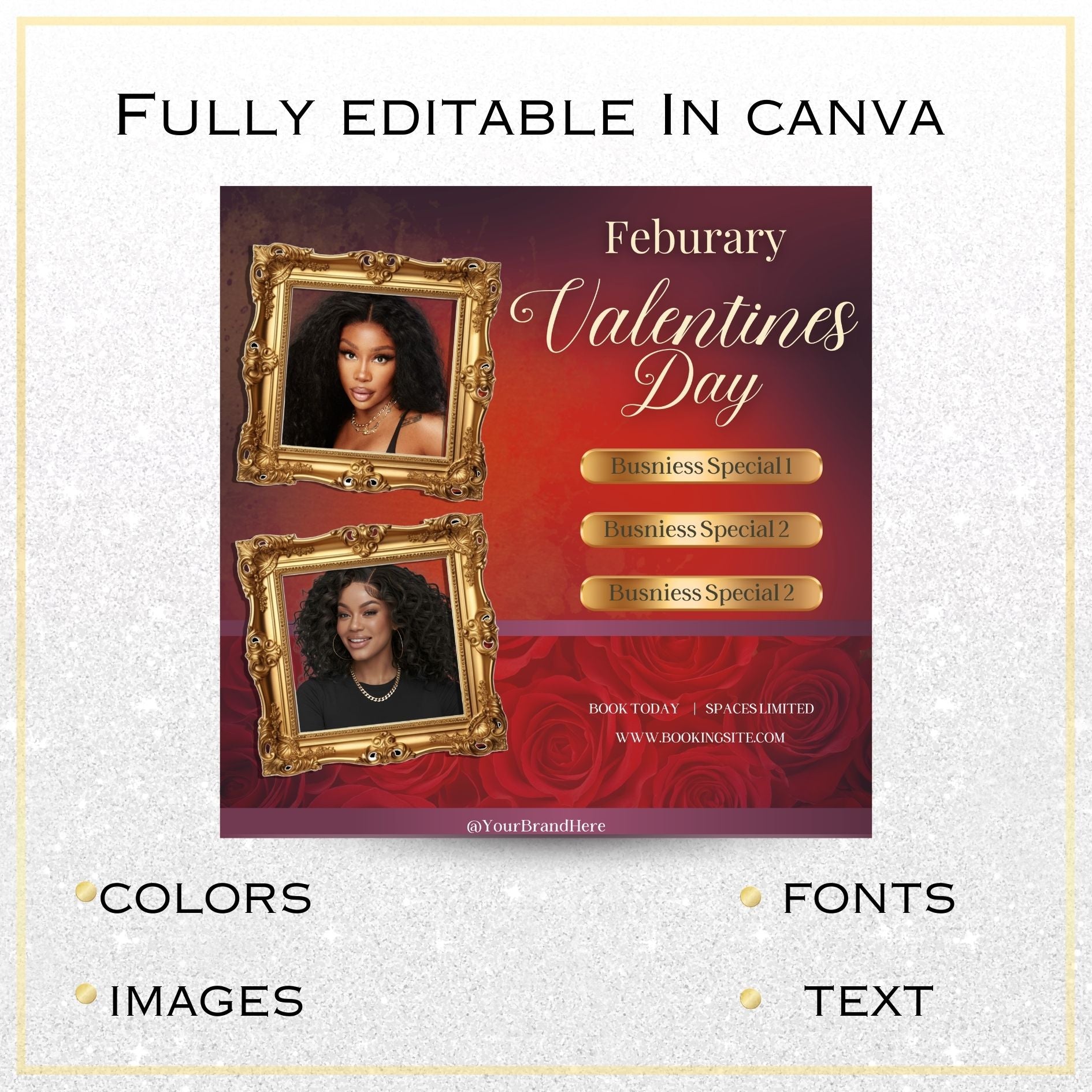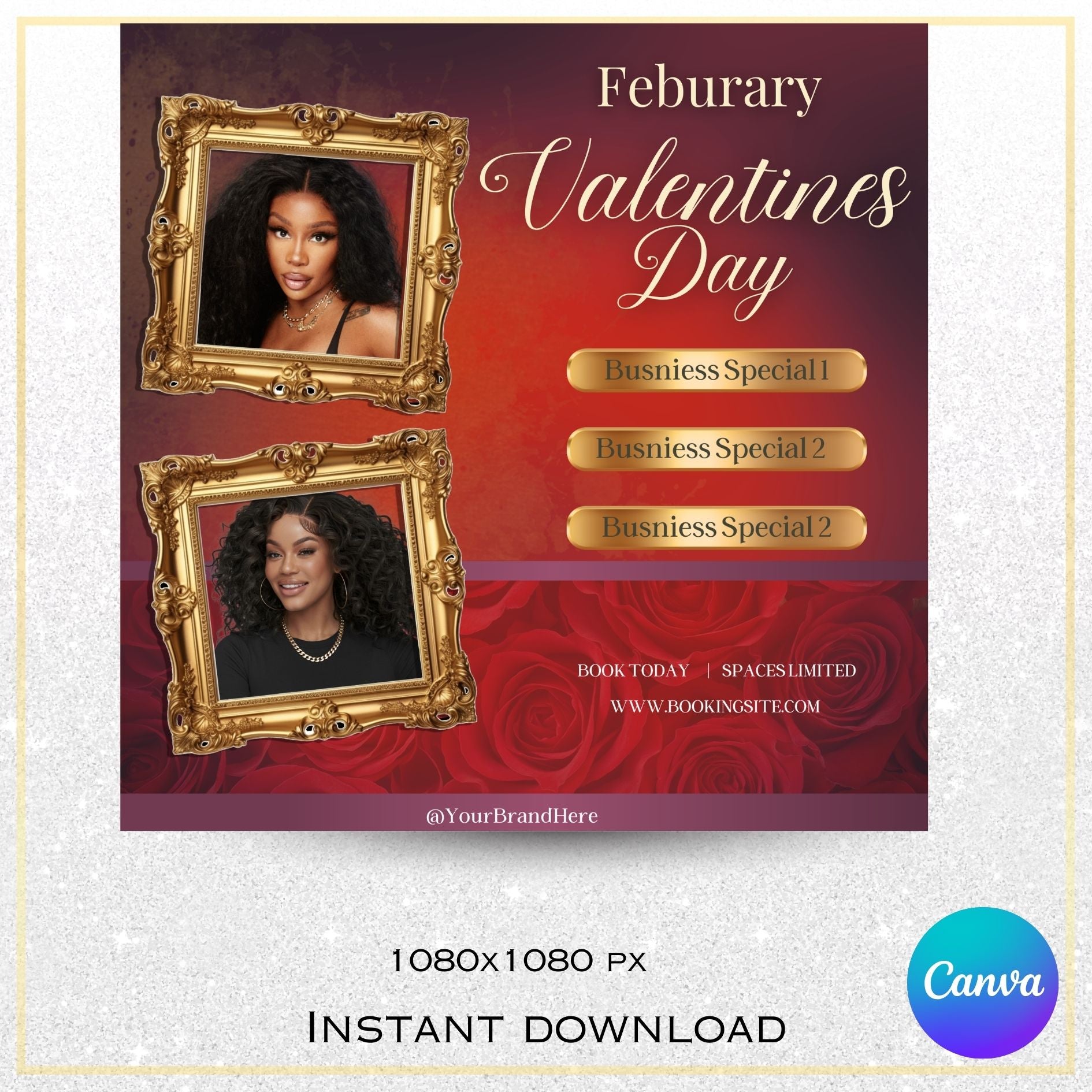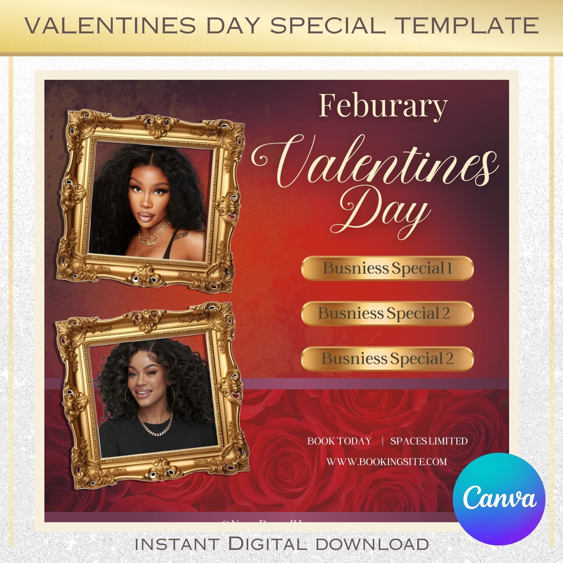 Spread the love and make your business shine with this Gold Framed Valentine’s Day Special Template! Designed with a luxe gold frame and pops of romantic red, this template is the perfect way to showcase your Valentine’s Day specials. Whether you’re promoting sales, services, or events, this fully customizable digital template makes it easy to add your images, details, and unique touch.